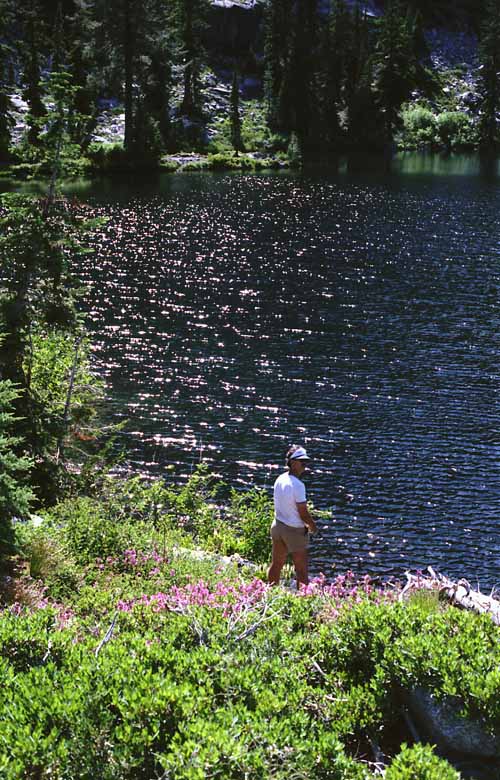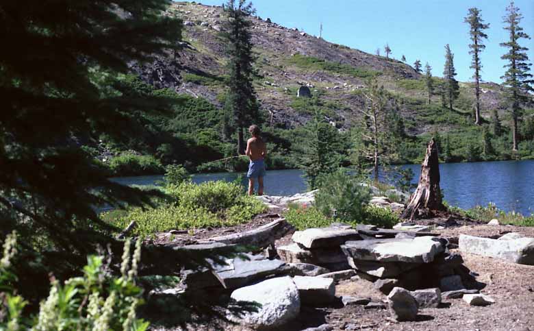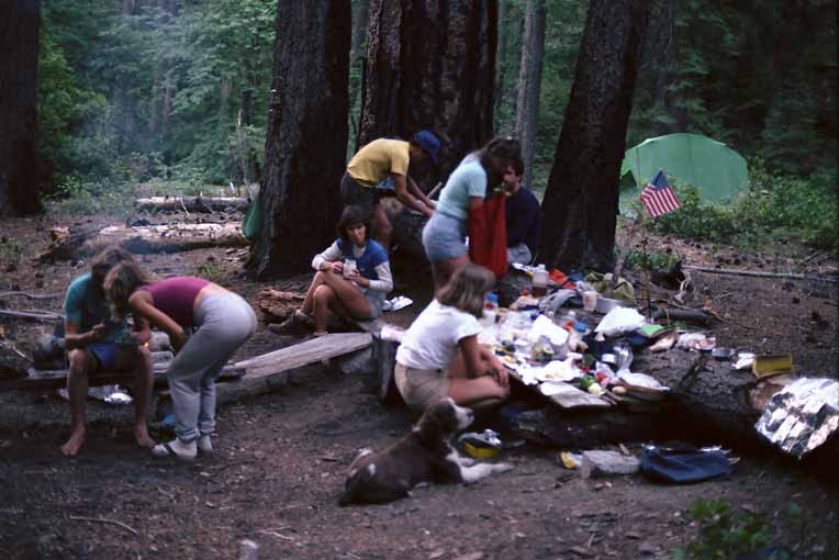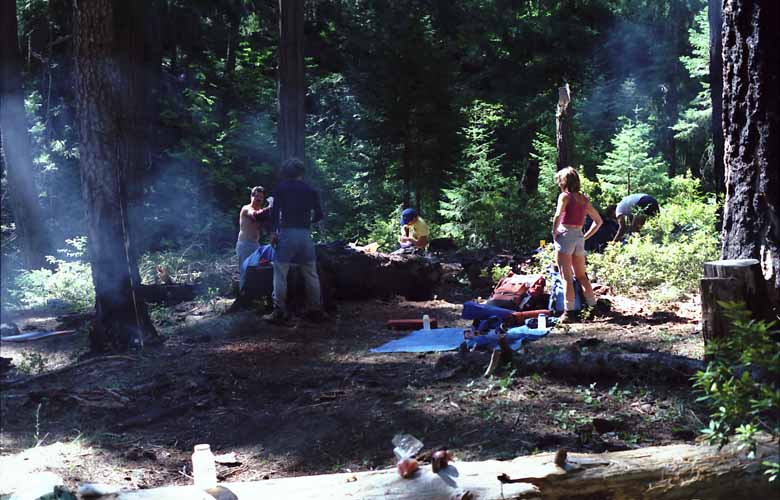 The first day, we just sort of lollygagged around camp and absorbed the good air and water. Deep in the forest, Laurel and Sherri caught a few rays and read, while Paul got ready to dip his line in the Little South Fork.