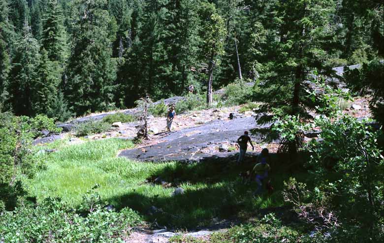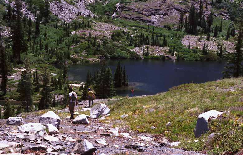 Before long, the route leveled-off and we found a warm tarn. It looked inviting, so we took a little dip. Right on the other side of the tarn, the route descended down to the lake. Eddie leads Paul and Jerry.