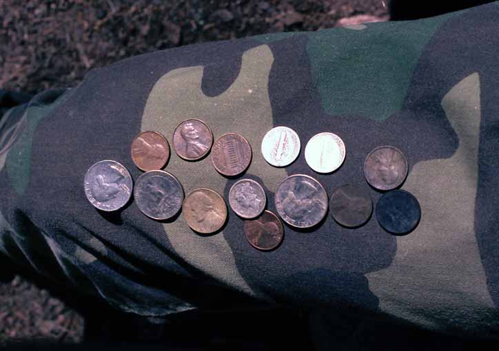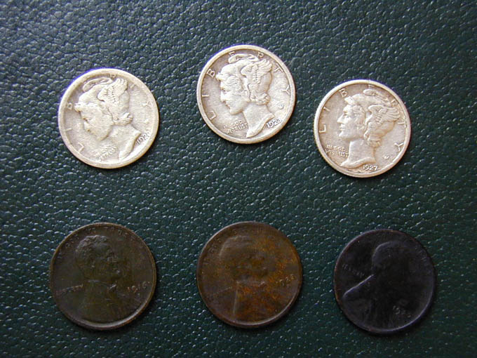 I had hauled my trusty ADS II in with me. I made my way over to a flat area near the creek and bing, bang, boom. First up was an extremely fine 1927-S Mercury dime. It still has a trace of mint luster. Minutes later, a very fine 1923-S Merc appeared, followed by a 1920-S Merc in good condition. Several minutes later, not very far away I found a 1916-S, 1927-S and 1923-S penny. Not bad for about a half hour's work. Given the wear-state of both the 1927-S penny and dime, and the close proximity of all the finds, it's reasonable to concoct a story. An old miner was up at this site in the late 1920s. He either tied one on and flopped around on the ground, or maybe his pants were so well worn that a hole in the pocket let the coins escape. I came along over 55 years later to recover them.