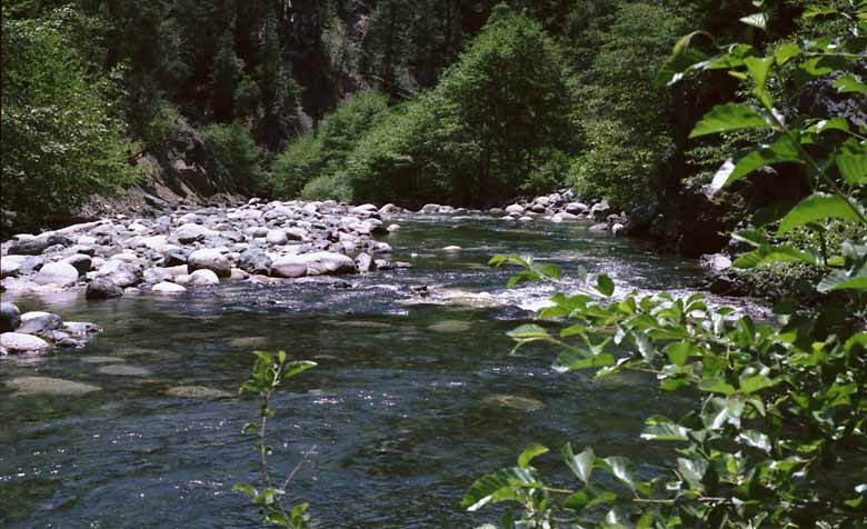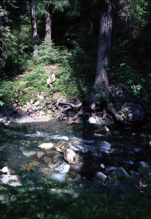 I can't believe we only hung around for a couple days. I guess I didn't have nearly as much vacation time back in those days. On the way out, we stopped to swim in the South Fork of the Salmon River. Jerry and Paul tried to beat the current. The current won. I saved them the embarrassment of scanning their pictures in their gutchies.